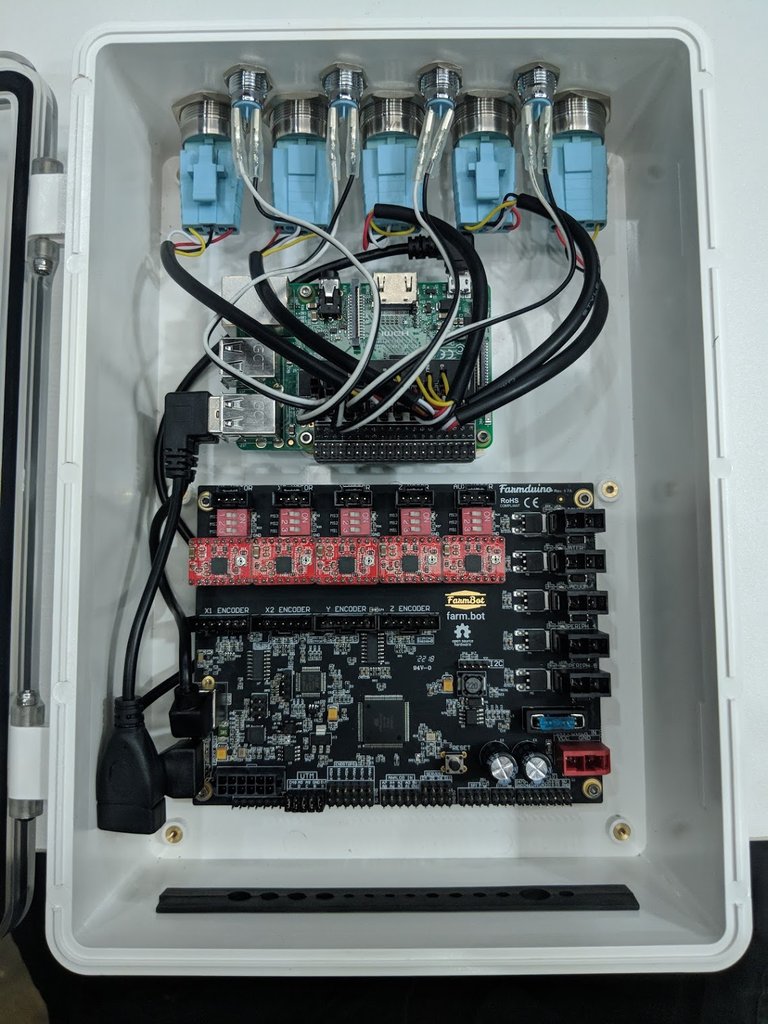As you can see in the images above and below, the box now features five push-buttons and four LED indicator lights which are connected to the Raspberry Pi’s GPIO via an adapter board. Two buttons and two LEDs will be reserved for E-Stop, Unlock, Sync Status, and Connection Status, while the remaining buttons and lights will be user customizable. Some examples of how you can use these: make a demo sequence that executes upon button press, flash an LED 5 seconds before a sequence is going to begin, turn a peripheral on/off with a button, tell the FarmBot to Find Home with a button press, etc.
