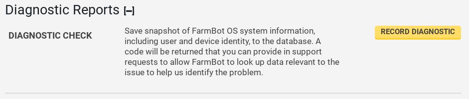 We’ve also added a Record Diagnostic button to the Device widget that saves a diagnostic report with information from FarmBot OS to the Web App. If you are experiencing trouble with your FarmBot, you can press the button to save relevant status information to the Web App database and provide the report identifier to us in a support request. We will be able to pull up the diagnostic data to help us identify issues and implement fixes more quickly. Reports do not contain personal information, although they can be used to identify your account. We recommend sharing only the ticket identifier, not the report, online.