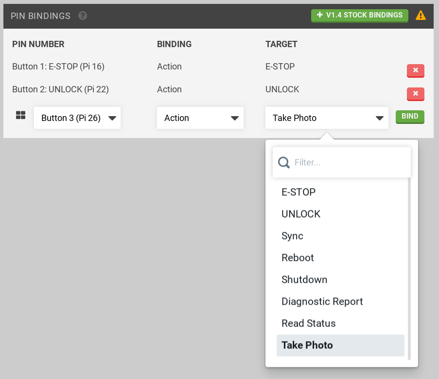 Buttons functions can be added via the Pin Bindings widget. The button functions shown can be added by pressing the + v1.4 Stock Bindings button in the Pin Bindings widget, while other actions can be selected by using the dropdown menus. In addition to being able to execute any sequence, new available actions include emergency stop, unlock, sync, reboot, take a photo, and more. We’ve also modified the existing widget inputs to make them easier to use.