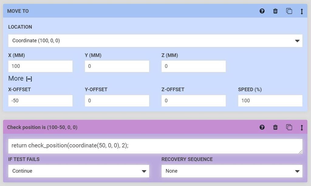 If you're familiar with automated software testing methodologies, you'll be right at home with the assertion command. Simply write an assertion in Lua, and then specify what FarmBot should do if the the test fails. Options include Continue, Recover and Continue, Abort and Recover, and Abort.