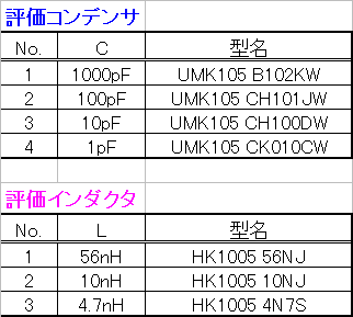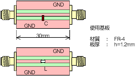 1.実験1について 最初の実験では、様々な回路に使われるチップコンデンサとチップインダクタの特性 を調べてみましょう。携帯電話などの民生用高周波機器の市場拡大と開発競争により、 それらに使われる部品も小型化と高周波特性の改善が急速に進みました。何気なく使用 しているチップ部品は、使用している周波数帯において、チップコンデンサはCとして、 チップインダクタはLとして本当に働いているのでしょうか? チップ部品の主流は1005タイプになっていますので、1005タイプのチップコ ンデンサ(積層)とチップインダクタ(積層)の特性を調べてみましょう。Qなどの特 性はメーカーのデータシートにありますので、ここでは回路内で使った場合を想定して 実験します。図1−1に実験基板を示します。長さ30mmのマイクロストリップ・ラ イン(特性インピーダンス50Ω)の中央付近に部品を実装して挿入損失を測定しまし た。図に示すように、コンデンサはラインとGND間に接続し、インダクタはラインの 途中に挿入しました。図1−1 実験基板 ○ 測定器 : HP8753D (Full 2-Port Calibration) ○ 評価部品(今回は手元にあった太陽誘電(株)製の以下の部品を使用しました)