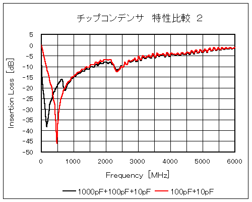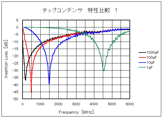 図1−3 実験基板の特性(VSWR) 3.チップコンデンサの特性 個々のチップコンデンサの特性を図1−4に示します。各コンデンサの自己共振周波 数は、1000pF:約200MHz,100pF:約500MHz,10pF:約1500MHz,1pF:約4500MHz に あることが判りました。バイアスラインなどのデカップリング・コンデンサは、使用周 波数帯を考慮して慎重に選ぶ必要があることを再認識しました。 一つのコンデンサでは広い帯域をカバーできていません。そこで複数のコンデンサを 組み合わせた場合にどのような特性になるのか調べてみました。図1−5にその特性を 示します。う〜ん。。。