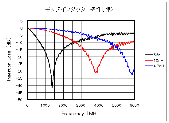 図1−5 チップコンデンサの特性2 4.チップインダクタの特性 チップインダクタの特性を図1−6に示します。各インダクタの自己共振周波数は、 56nH:約1400MHz,10nH:約3900MHz,4.7nH:約5800MHzにあることが判りました。高 周波特性が本当に良くなったと感じました。