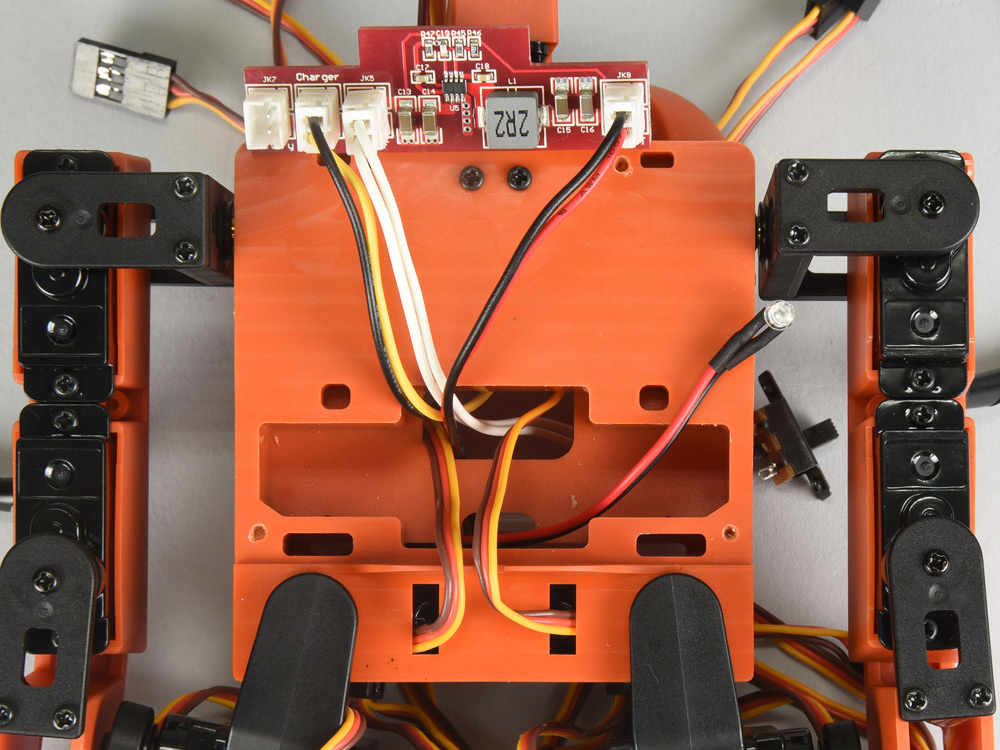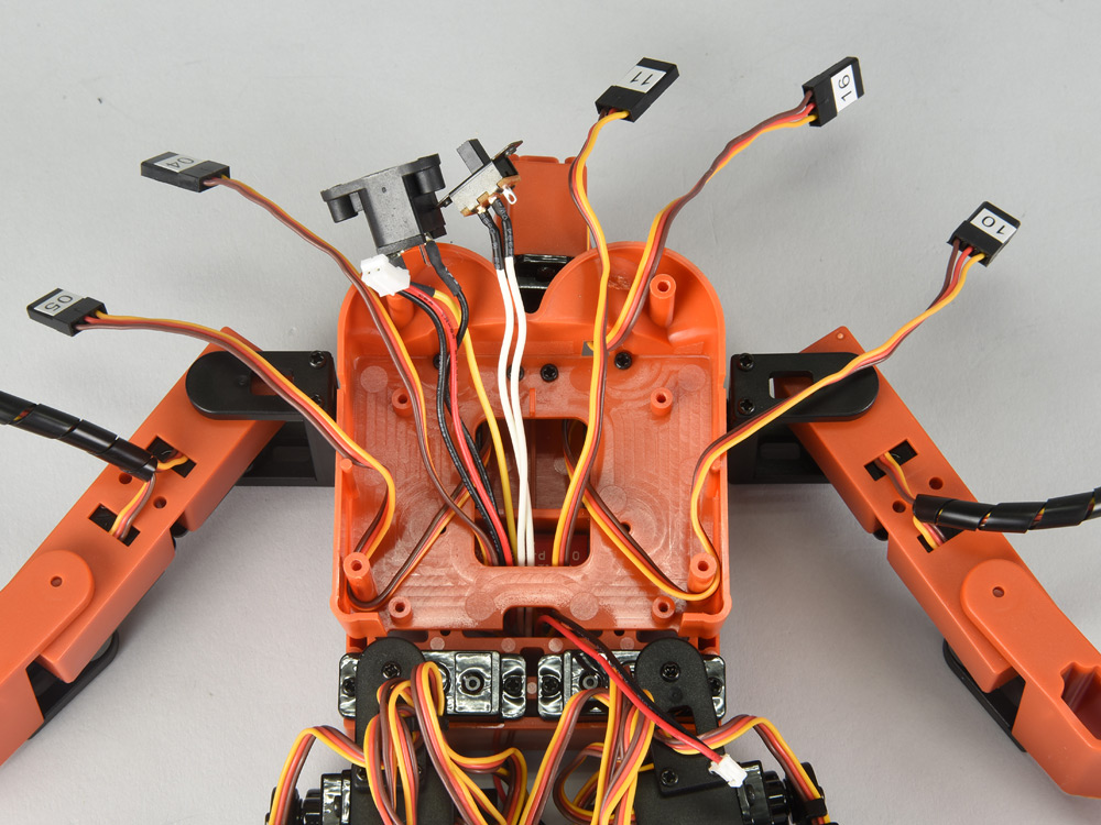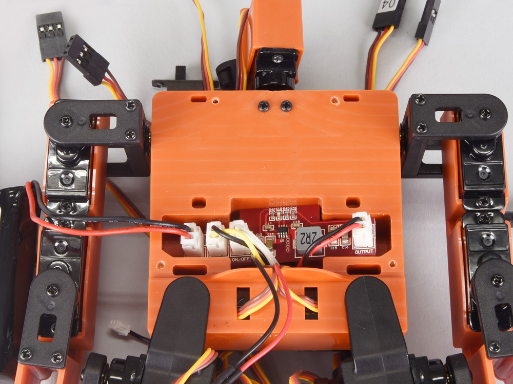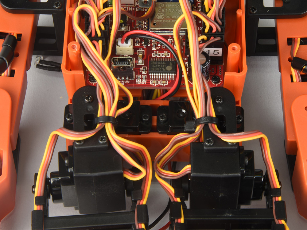 Arrange the wire of main control panel according to the figure and reserve enough space for left/right leg servo wire (#0,#1,#2,#3,#12,#13,#14,#15) and then put them to fixed positions, use binding belt to fix them.