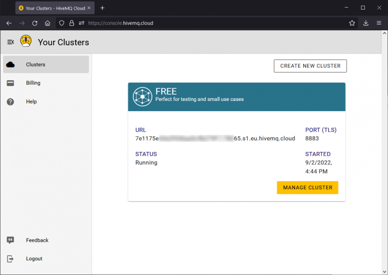 3. Note the connection details (URL and port) of the newly created cluster and click on Manage cluster