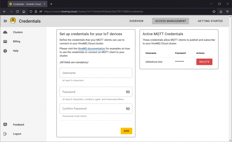 4. Click on Access management at the top and setup new credentials – username and password, which will be used by Slideshow to access the MQTT cluster.