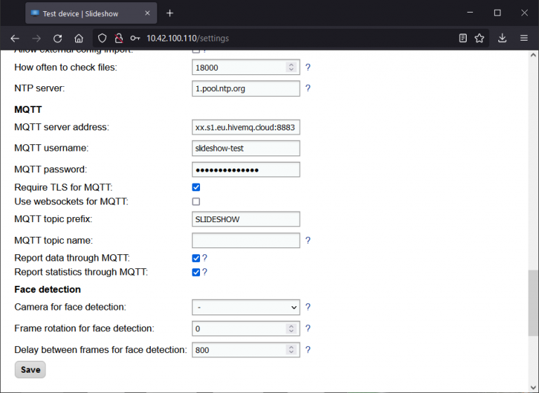 MQTT integration requires an external MQTT broker, to which Slideshow can connect. You can either install HiveMQ or Mosquitto brokers on your server, or use a cloud service, for example HiveMQ Cloud (https://www.hivemq.com/mqtt-cloud-broker/). HiveMQ Cloud is free for up to 100 client devices, meaning you can connect for example one management application and up to 99 devices with Slideshow app for free. It doesn’t support separate permissions for each credentials, so make sure you don’t share your MQTT username and password with anybody.