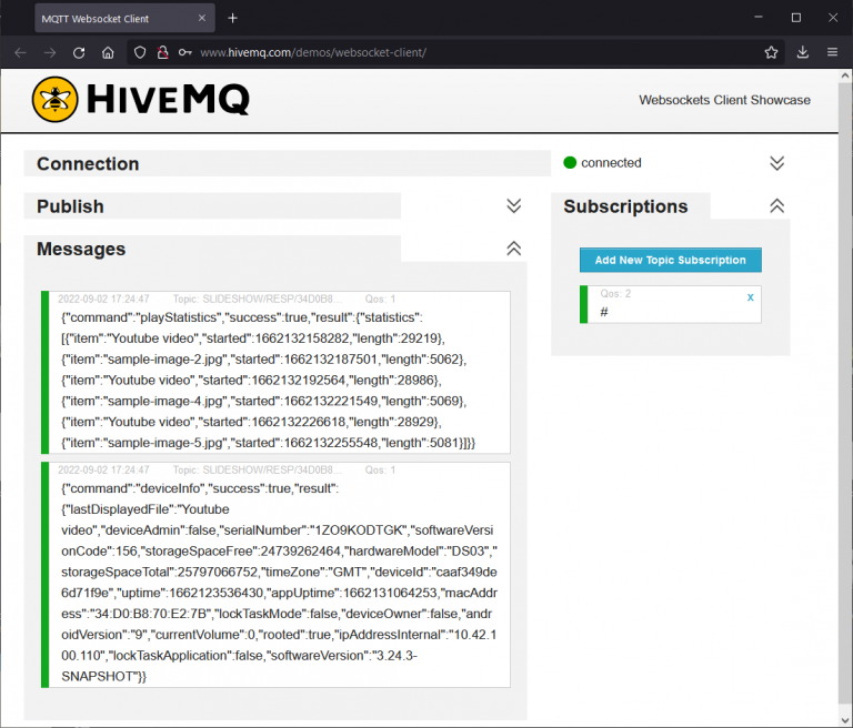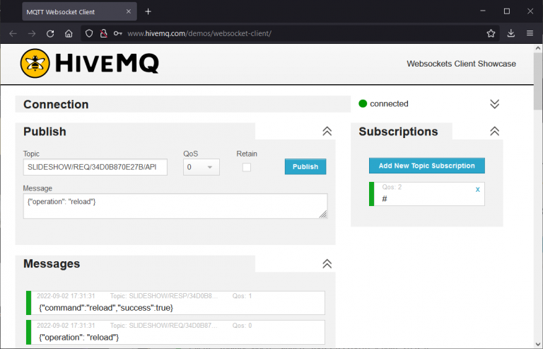 Below you can find a step-by-step tutorial of connecting Slideshow to HiveMQ Cloud and testing the connection by receiving status messages and issuing a command.