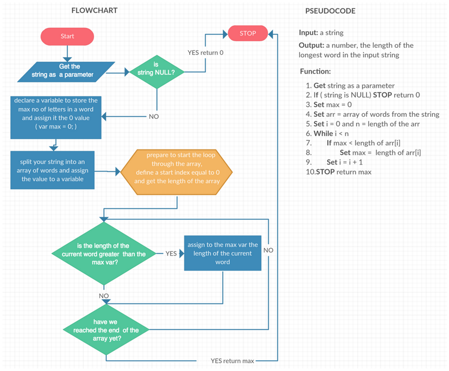 If we follow the schema AND/OR the pseudocode, writing the function that gives us the length of the longest word in a string shouldn’t be very hard now … in any language … not just in javascript.